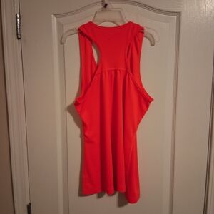Vibrant neon pink tank with racerback styling. Lightweight, breathable performance fabric. Simple scoop neckline for easy layering. Casual athletic look for workouts or everyday wear.
