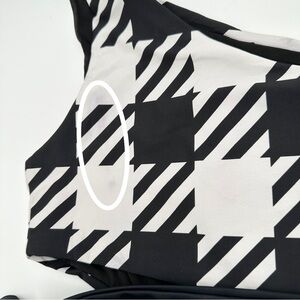 Never worn. hygienic liner attached. A little light color transfer near top of swimsuit. Circled in photo.