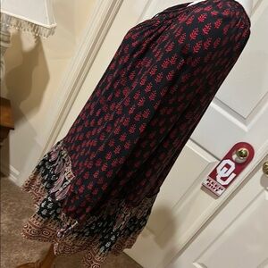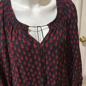 Stylish blouse/coverup with red patterns on black. Features a gathered neckline and tie detail. Perfect for the beach. Pre owned.