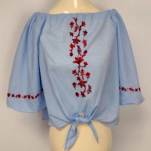beachlunchlounge Blue Red Puff Sleeve Embroidered Off Shoulder Top Sz XS Boho