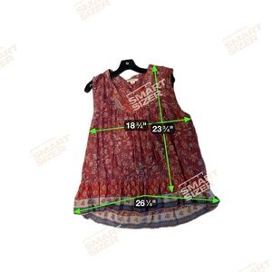 Chic sleeveless blouse with floral design. Raspberry, ivory, blue, rust hues. Perfect for casual outings.  Goes well with denim.