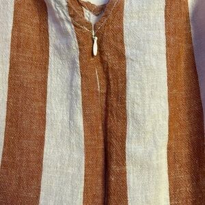 Stylish striped jumpsuit by beachlunchlounge. Features rust and white vertical stripes. Sleeveless with a V-neckline. Perfect for casual outings.