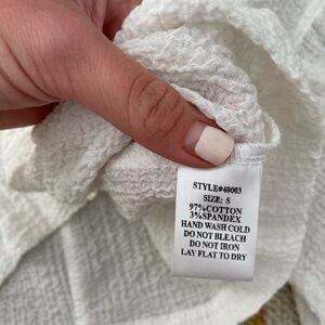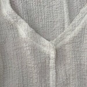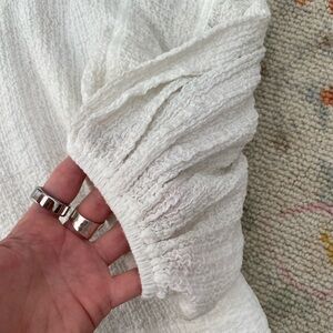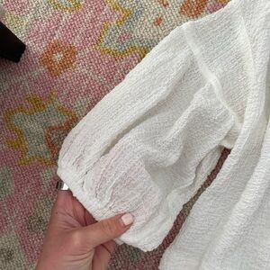 White v-neck top with balloon sleeves and elasticized wrists. Casual, California vibe. Purchased at a local boutique in SF. Brand: Azoe.