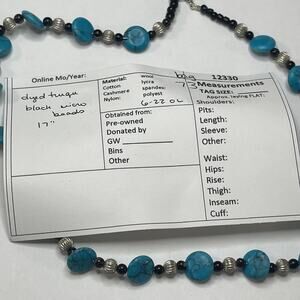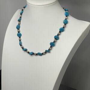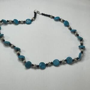 Picturing the fashion costume unsigned jewelry beaded necklace with faux turquoise dad stone jewelry in Silver tone with some black Micro beading. Length: 17 inches. Condition: preowned gently worn, no flaws noted. Please see pictures for details. Inventory: bag 73. 12330. I ship quickly from a clean, smoke free home. Don’t miss this turquoise blue collar Dyed stone beaded necklace perfect for contemporary casual or career where.
