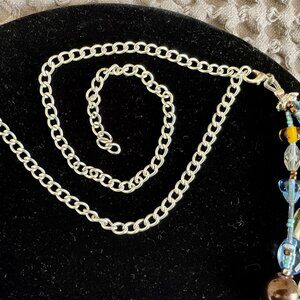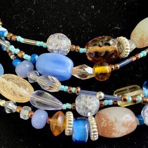 Beautiful beaded 5 strand necklace in blues, brown and ivory colors that is adjustable so can be worn long, shorter or choker style. Hand made