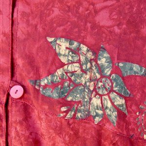 Never worn rayon, batik blouse that can be worn in so many ways! You can dress it up, wear it with jeans, wear the buttons open or closed. Sleeves can be worn full length or rolled up. The size is marked 3X but it is more like a 2X....keep that in mind! You are sure to get compliments whenever you wear it!
