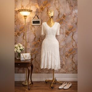 Elegant white lace dress with sleeves. Perfect for special occasions. The fabric is stretchy and in excellent condition. Smoke-free and pet-free home. Next-day shipping.