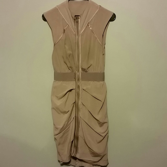 This is a silk, zip front dress ruched on the lower front and back. There is an imperfection as seen in the picture the elastic belt is a little frayed.