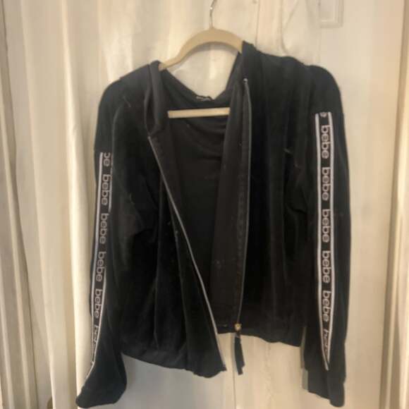 Vintage Bebe black velour zip-up hoodie featuring branded logotape along the sleeves. This Y2K-inspired track jacket includes a full front zipper and classic hooded design. Pre-owned condition with some visible lint and light wear as shown in photos. Perfect for casual streetwear, lounging, or a throwback 2000s aesthetic. Cotton polyester blend for a soft, plush feel.