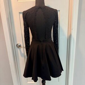 bebe black cocktail dress, Size 4, EUC. Great little black dress perfect for any dress up occasion. Zip back skirt closure - open back and small button closure at neckline. Fully lined bodice with built in bra and tulle under skirt for extra volume. Lace is stretchy for comfortable fit. Measures: 16" arm pit to arm pit, 26" waist, and skirt length is 17".kd