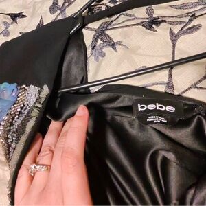 Chic black dress with striking silver embellishments. Long sleeves and deep V-neck. Perfect for evening wear.