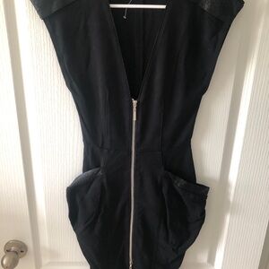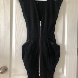 Chic black mini dress by bebe. Features a front zipper and stylish pocket design. Perfect for a night out.