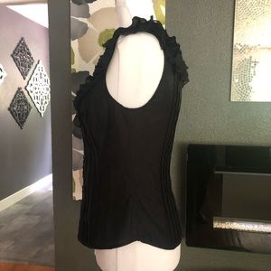 NWT Bebe Black ruffle and pleat sleeveless blouse. Fabric is semi sheer and has a bit of sheen to it. Small polka dot pattern throughout. Silk/Cotton blend. Extra button attached. Tag says small but please see measurements.