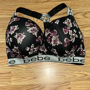 Stylish black bra with purple floral design. Features silver accents and branded straps.