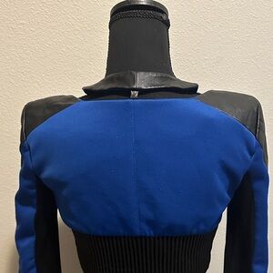 Sleek blue and black bomber jacket by bebe. Modern design with a bold look. Ideal for stylish outings.