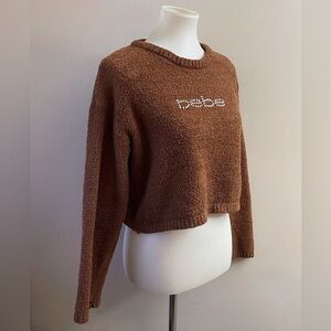 Cozy chocolate brown size small oversized textured crew neck crop sweater. Features a jeweled bebe logo and some stones are missing. As shown in the photos. One of the sleeves have a tear at the bottom of the sleeve. Shown in the last photo.