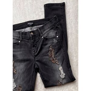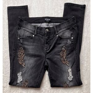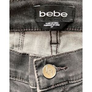 bebe Embellished Rhinestone Detail Mid Rise Skinny Leg Jeans in Black, Size 29