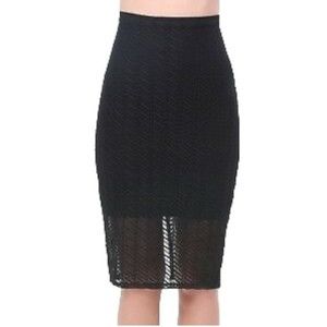 Textured mesh skirt midi silhouette mini lined Black zip bebe pencil skirt black sheer lace over midi silhouette lined back zipper closure with clasp back slit 98% nylon 2% spandex measurements are approximately in inches Waist 28” length 28” Hips 16”