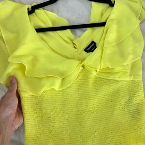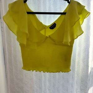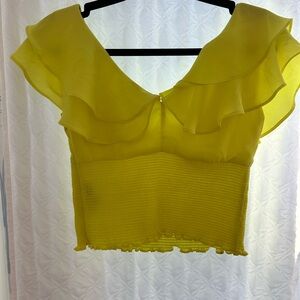 Add a pop of color with this lemon ruffled off-shoulder blouse. Ideal for a stylish and fun outfit.
