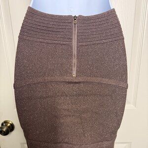 This stunning bebe bandage skirt combines sleek sophistication with a hint of sparkle. The metallic bronze knit fabric sculpts and flatters your shape, while ribbed and contoured paneling accentuates your curves.