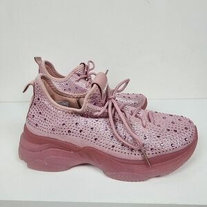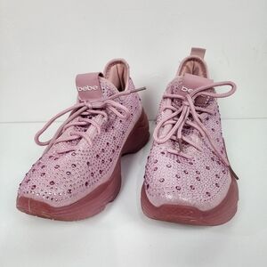 These bebe sneakers feature a soft dusty rose upper made from breathable mesh material. The slip-on design offers convenience while the thick chunky sole provides comfort and a slight platform look.