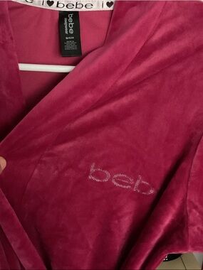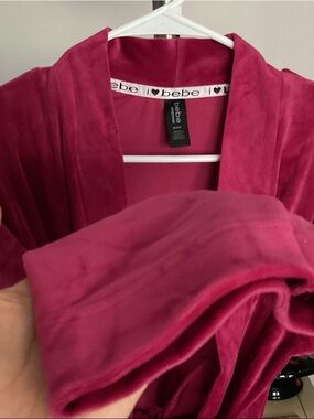 Plush wrap robe by bebe in a rich raspberry pink shade. Soft, velvety fabric with a self-tie waist. Designed for comfortable lounging and easy wear. Simple, cozy style for daily use.