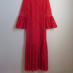 This dramatic red lace dress would look amazing on stage or on the dance floor at a special occasion. Made by bebe when the brand’s quality was higher, it has never been worn, though the tags have been removed.