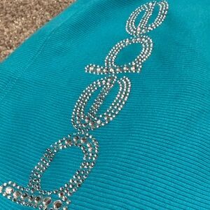 Super cute early-2000s style bebe tube top in a vibrant turquoise blue. Features the classic sparkly rhinestone “bebe” logo across the chest. Stretchy ribbed knit fabric for a flattering, fitted look.