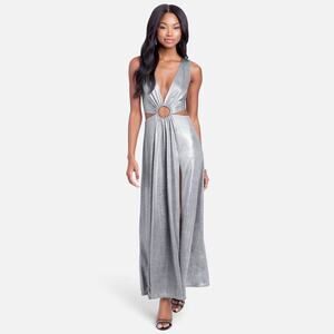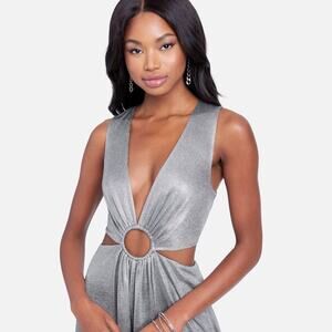 bebe Ring Detail Sparkle Knit Cut-Out Maxi Dress Womens Small Silver Metallic