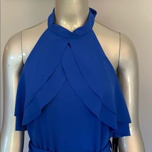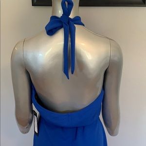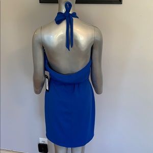 A tired ruffle upper details this halter mini dress. - Halter strap - Ties at neck - Ruffled upper trim - Ties at waist - Lined - Mini length