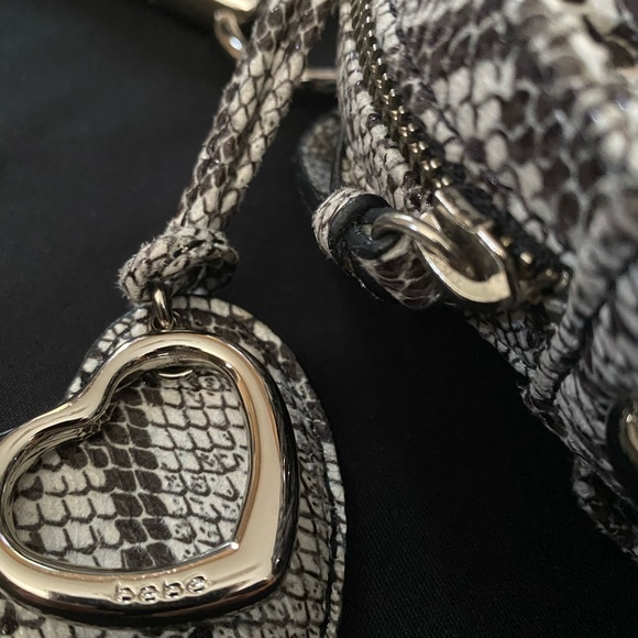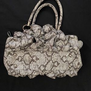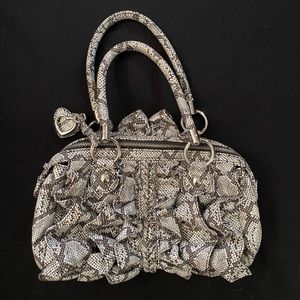 Like new bebe brand ruffled polyester handbag with snakeskin design. Silver hardware.