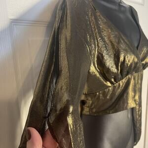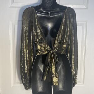 bebe Blouse Womens XS Gold Metallic Wrap Tie Crop Top Long Sleeve V Neck Party