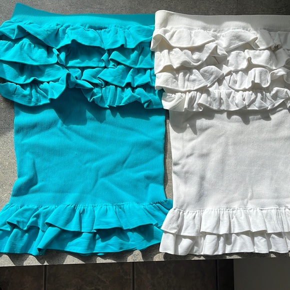 bebe Tube Tops (2). One white, one turquoise color (“Jewel of the Nile”). Size M/L. Very nice, soft material. 92% Nylon, 8% Spandex. Nice condition. Buy both or separate!