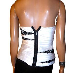 You are viewing a cute Strapless top by bebe Sz S, White/Black, Cotton/Polyester/Spandex/Nylon/Viscose, Lace, measurements were made with the garment lying flat unstretched bust 28", bodice to hem 15" top is NWT and retails for $79.00.