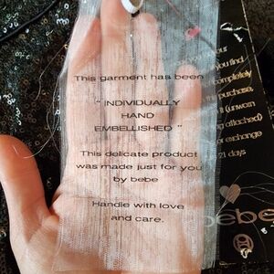 Photos don't do this dress justice. It's individually hand embelished ( sequins) with a sweetheart mesh neckline and a peplum and bodycon style.