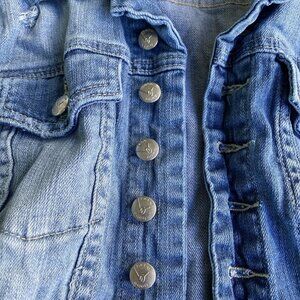 The product is a bebe Y2K Blue Distressed Denim Jean Jacket in size Small. Made of cotton denim, this vintage-style jacket features a collared neckline and pockets, making it a classic addition to any woman's wardrobe. The distressed detailing gives it a trendy and unique look, perfect for adding a touch of edge to any outfit. With its basic jacket style, this piece is versatile and can be easily dressed up or down for any occasion.