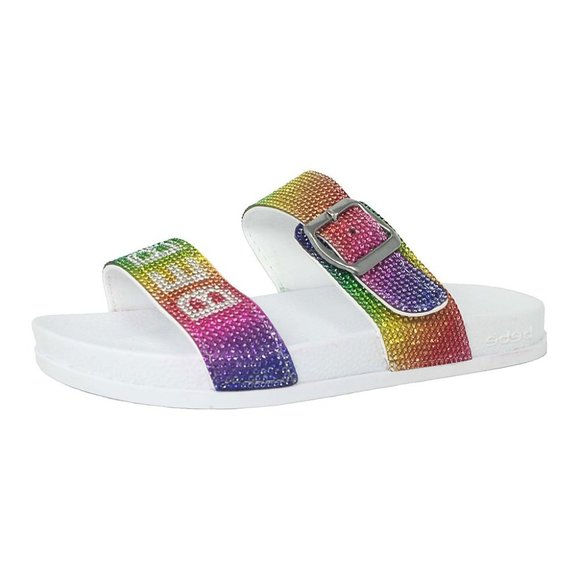 bebe girls White Rainbow Rhinestone Buckle Logo Slide - Girls