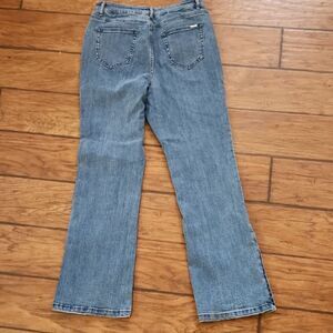 Chic flare jeans with stylish button accents. Perfect for casual outings. Comfortable fit. Excellent pre-owned condition. Waist laying flat is 16". Midrise 12". Inseam is 31".