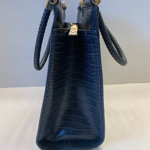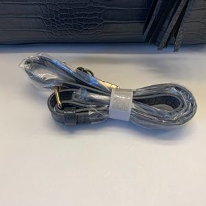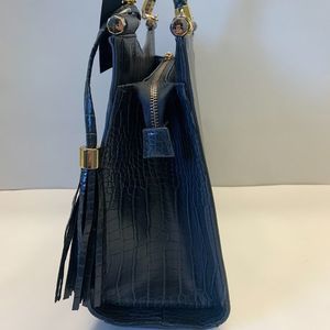 bebe Natalie Croco Shopper Satchel Handbag Grey - Gorgeous NWT, this mock croc tote is professional and sleek. Faux patent leather and braided handles and fun fringe (removeable) accents. Also includes a crossbody strap. Zipper closure with gold accents and studded bottom. Plenty of room inside, easily fits an iPad and much much more. Also zipper pouch inside for organization.