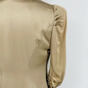 Asymmetrical open front waterfall blazer in soft gold. Ruched 3/4 length sleeves. Faux pockets design. Lightweight satin material. Elegant collar design (just as beautiful closed as it is open). Beautiful flowy piece. Pairs well with pants/shorts with pumps, sandals, or combat boots. True gem! Discontinued style. Smoke-free & pet-free home.