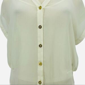 Beautiful short sleeve blouse. Sheer material and loose fit. Gold buttons. Includes the same white cami that came as part of the blouse. Cami has adjustable spaghetti straps. There is an inner plastic clip sewn inside the shoulder which loops around the spaghetti straps and remains snapped to keep it in place (Photos #9-10). Lightweight and comfortable. Discontinued style. Smoke-free and pet-free home.