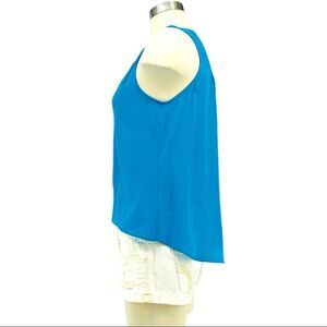 Button down sleeveless blouse in Capri Breeze (blue). All gold buttons are sewn tight (with not a single one loose). V-neck. High-low hemline is flowy. Comfortable and breathable, perfect for summer. Pairs best with shorts (blue jean, olive, white). Discontinued style. Smoke-free and pet-free home.