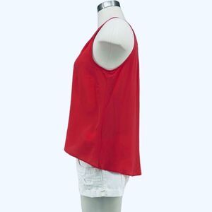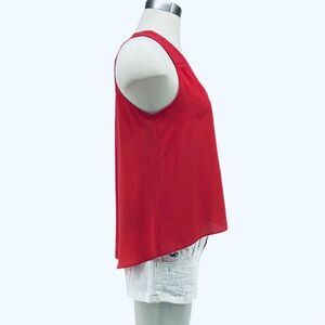 Button down sleeveless blouse in hibiscus/coral/watermelon. Gold buttons are sewn tight (with not a single one loose). V-neck. High-low hemline is flowy. Tiny stain on left side is barely noticeable (Photo #7 & 9). Comfortable and breathable, perfect for summer. Pairs best with shorts. Discontinued style. Smoke-free and pet-free home.