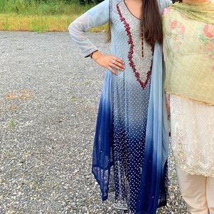 heavy embroidery and bedazzled blue chrome frock with tight blue pants and blue chrome dupatta. size small-medium. loose fit