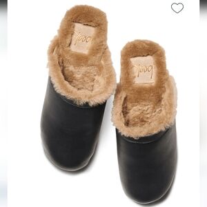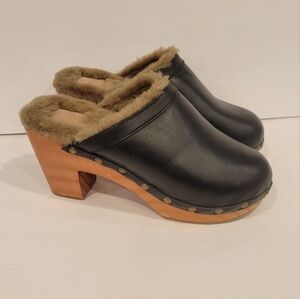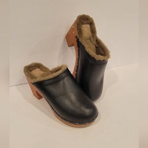 Stylish black leather mules. Wooden sole with studded detail. Comfortable and chic design.