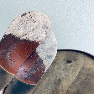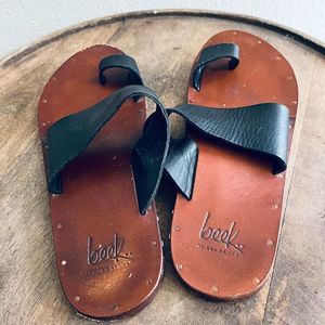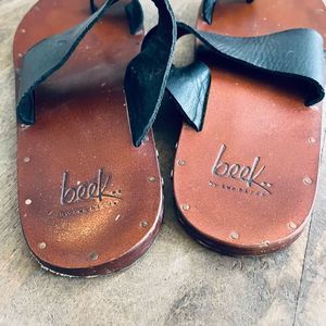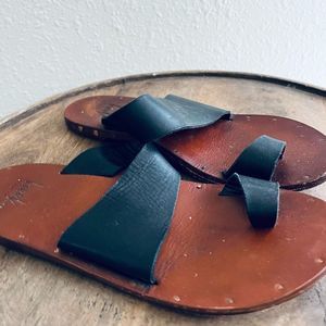 Stylish black leather straps. Comfortable brown sole. Perfect for casual wear.