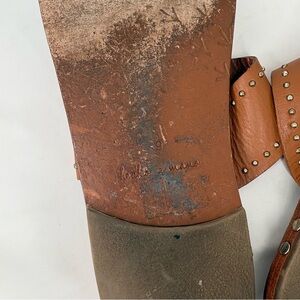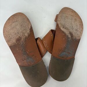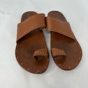 Beek brand Finch leather toe ring sandals with gold stud accents. Comfortable slip-on design with high quality, genuine leather. Some surface wear on the soles and footbed as shown in the photos but overall great used condition with no rips, stains, or holes.