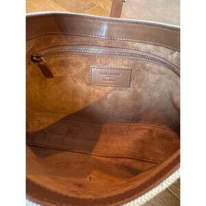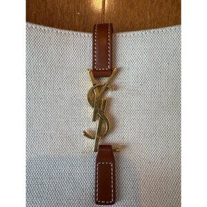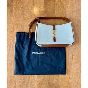 This is an authentic SAINT LAURENT Smooth Calfskin Canvas Le 5 à 7 Hobo in Natural Beige and Brick. Crafted from beige canvas with rich brown calfskin trim, it features a gold YSL monogram cross strap and a luxurious suede interior with a zip pocket. Purchased in Nassau, Bahamas – Spring 2023 and in gently used condition. Comes with original Saint Laurent dust bag.