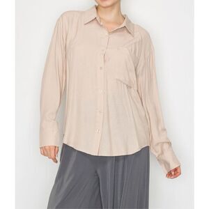 A basic linen shirt top features collar, button down, chest pocket, long cuffed sleeves, waist length, and a curved hem.