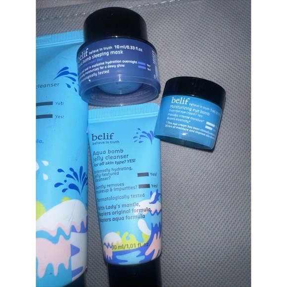 belif Aqua Bomb Bundle Of 4- jelly Cleanser, Eye Bomb, Sleeping Mask.
